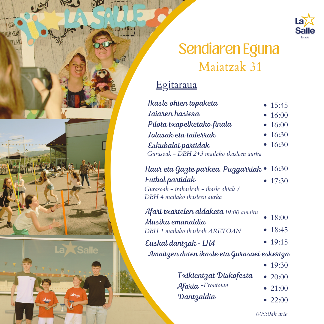 Eguerdiko etenaldiaren ondoren, iaz DBH4. maila bukatu zuten ikasle ohien topaketa izango da, eta 16:00etan izango da jaiaren hasiera. Ordu berean hasiko dira umeentzako jolasak eta tailerrak, eta pilota txapelketako finalak ere.