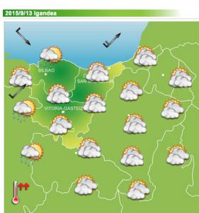 Uraren tenperatura 20 gradutakoa izango da, eta uretatik kanpo, 16 eta 26 artekoak. Kostaldean haizea noraezean ibiliko da eta ez da barnealdean bezain indartsua izango; arratsaldean, hori bai, iparraldetik finkatuko da eta orduan bai zakartuko dela apur bat.