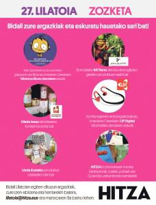 Zuen argazkiak HITZA taldeko webguneetan jarriko ditugu. Lilatoiko zozketa hau Irutxuloko Hitza, Lea-Artibai eta Mutrikuko Hitza, Goierriko Hitza, Urola Kostako Hitza, Busturialdeko Hitza eta Oarsobidasoko Hitzak elkarlanean egin dugu.