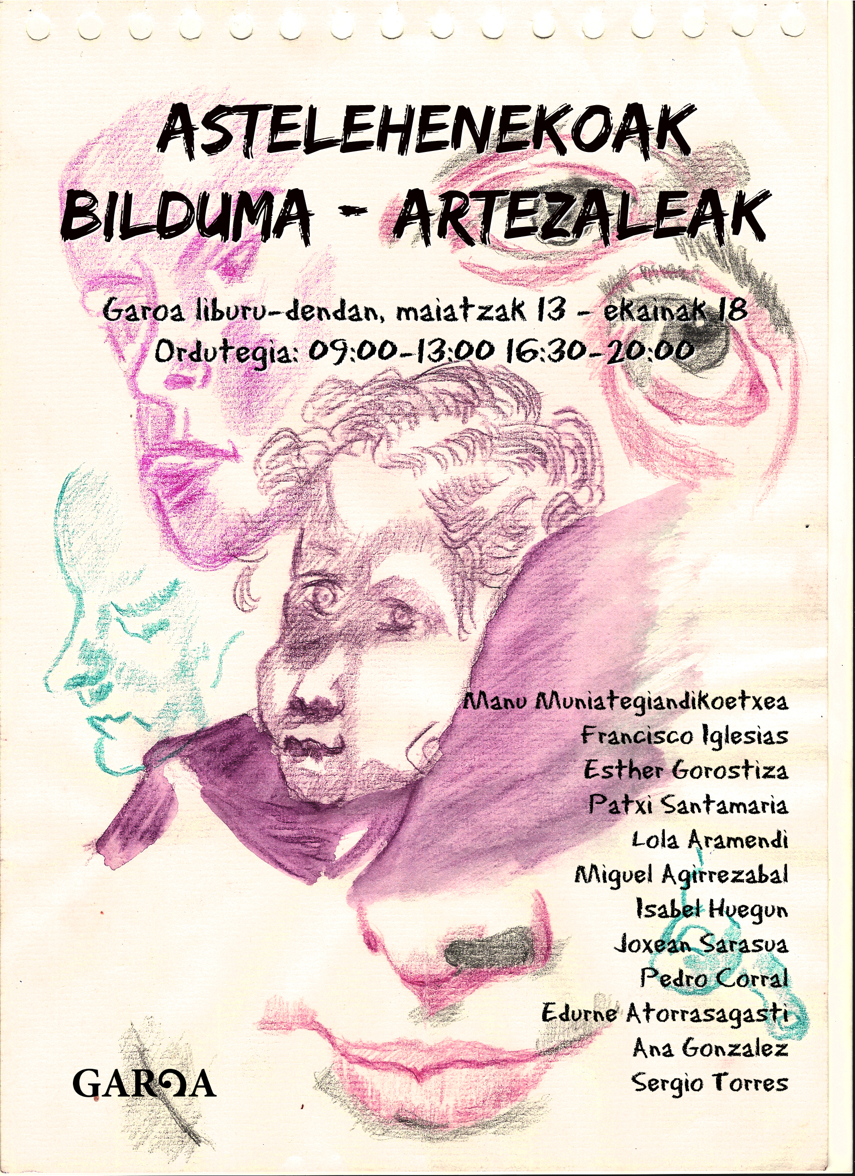 19:00etan inauguratuko dute Astelehenekoak bilduma Garoa liburu dendan. Artezaleak-eko Manu Muniategiren ikasleek egindako lanak jaso dituzte bilduma horretan, besteak beste, Francisco Iglesias, Esther Gorostiza, Patxi Santamaria, Lola Aramendi, Miguel Agirrezabal, Isabel Huegun, Joxean Sarasua, Pedro Corral, Edurne Atorrasagasti, Ana Gonzalez eta Sergio Torresek sortutakoak.