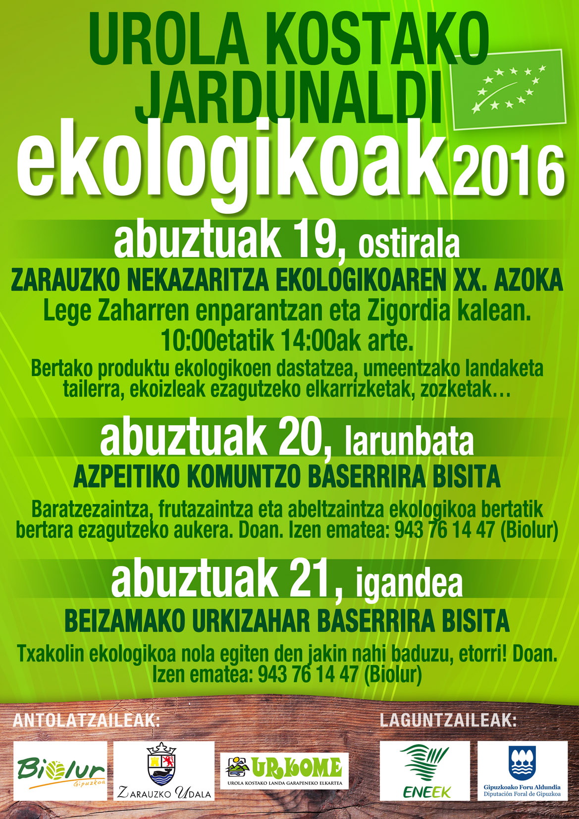 Biolur, Zarauzko Udalak eta Urkomek Urola Kostako Jardunaldi Ekologikoak antolatu ditu. Abuztuaren 19an Zarauzko Nekazaritza Ekologikoaren XX. Azoka izango da, Lege Zaharren enparantzan eta Zirgordia kalean, 10:00etatik 14:00etara.