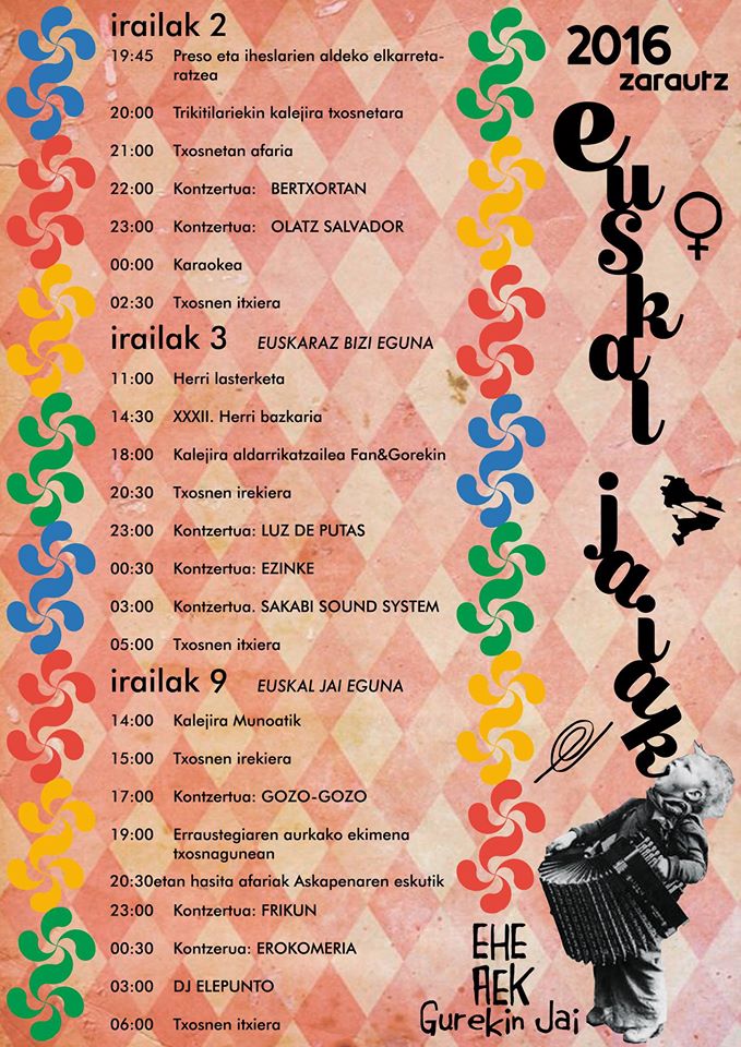Facebook atarira igo dute aurtengo Euskal Jaietako egitaraua, EHErekin eta AEKrekin elkarlanean antolatuta. Txosnagunea Salberdingo aparkalekuan izango da.