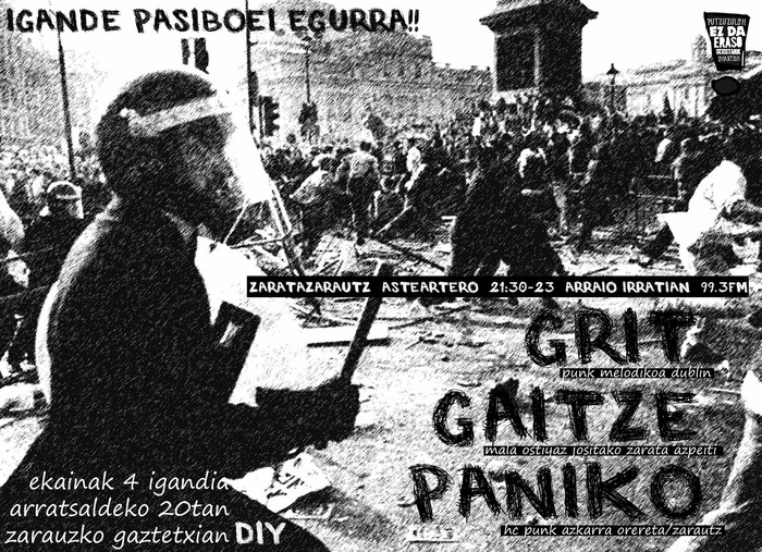 Igandean, berriz, kontzertuak izango dira, punk oi melodikoa jorratzen duten Grit, Gaitze eta Paniko taldeen eskutik. 20:00etan hasiko dira zuzenekoak.
