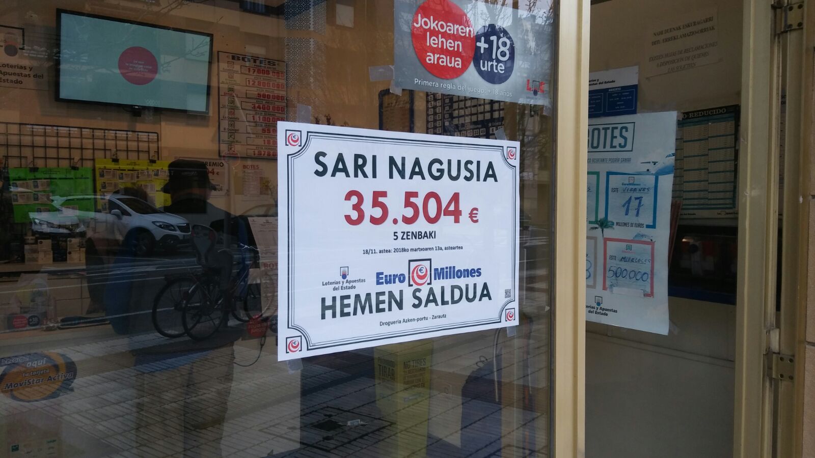 Astearteko (martxoak 13) Euromillones zozketak lehen kategoriko asmatzaile bakarra izan du; Portugalen egin zuen apustua eta 62.521.581 euro irabazi ditu. Era berean, hirugarren kategoriako sei asmatzaile izan dira, eta asmatzaileetako batek Azken-Portu drogerian jokatu zuen; 5 euro jokatu zituen bi apustuko txartel batera, hain justu ere. Hala, 35.504 euro irabazi ditu.