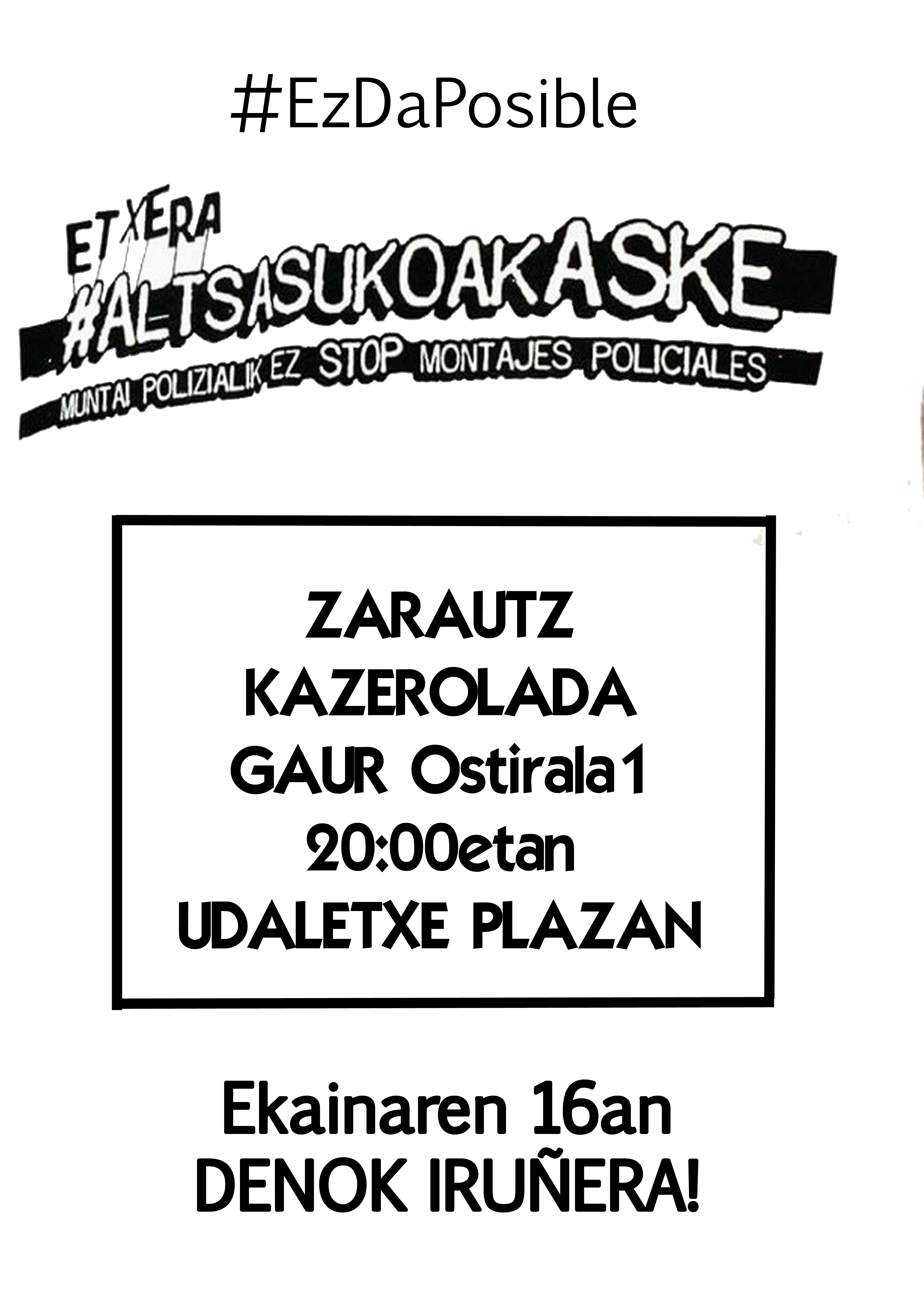 Bi eta hamahiru urte arteko espetxe zigorrak ezarri dizkiete Altsasuko auziko zortzi gazteei. Hori salatzeko kazerolada deitu dute gaurko, Lege Zaharren Enparantzan, 20:00etan.