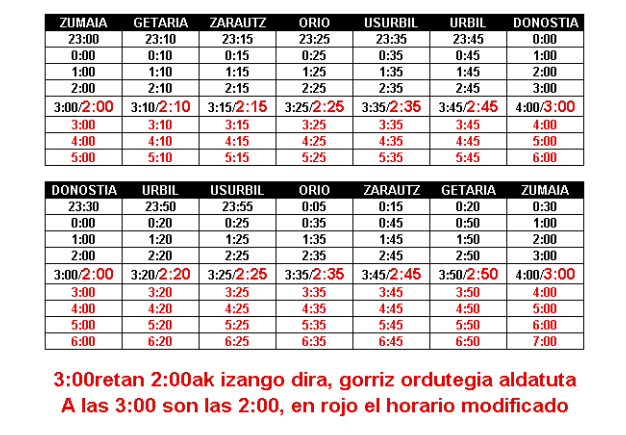 Neguko ordutegia indarrean sartuko da gaur goizaldean, larunbata; 03:00etan 02:00ak izango dira, eta ordu aldaketa dela eta, gaueko autobus zerbitzu berezia antolatu du Lurraldebusek. Zumaia eta Donostia arteko UK49G linean izango dira aldaketak, 02:00etan eskaini beharreko zerbitzua eskaini ahal izateko moduan egokitu dute autobusen ordutegia.