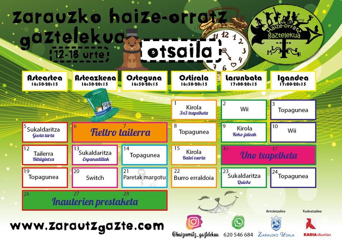 Sukaldaritza tailerrak, fieltro tailerra, Uno txapelketa eta 3x3 txapelketa antolatu dituzte, besteak beste. Inauteriak prestatzeko saioak ere izango dira, otsailaren 26tik aurrera.