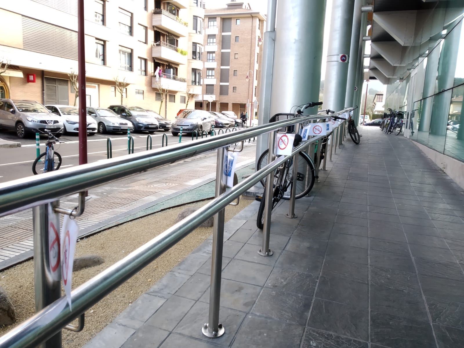 Kiroldegira sartzeko arrapala bizikletaz beteta egon ohi da sarri. Hori gerta ez dadin, kartelez josi dituzte arrapalaren alboak, bizikleta bertan uztea debekatuta dagoela argi utziz.