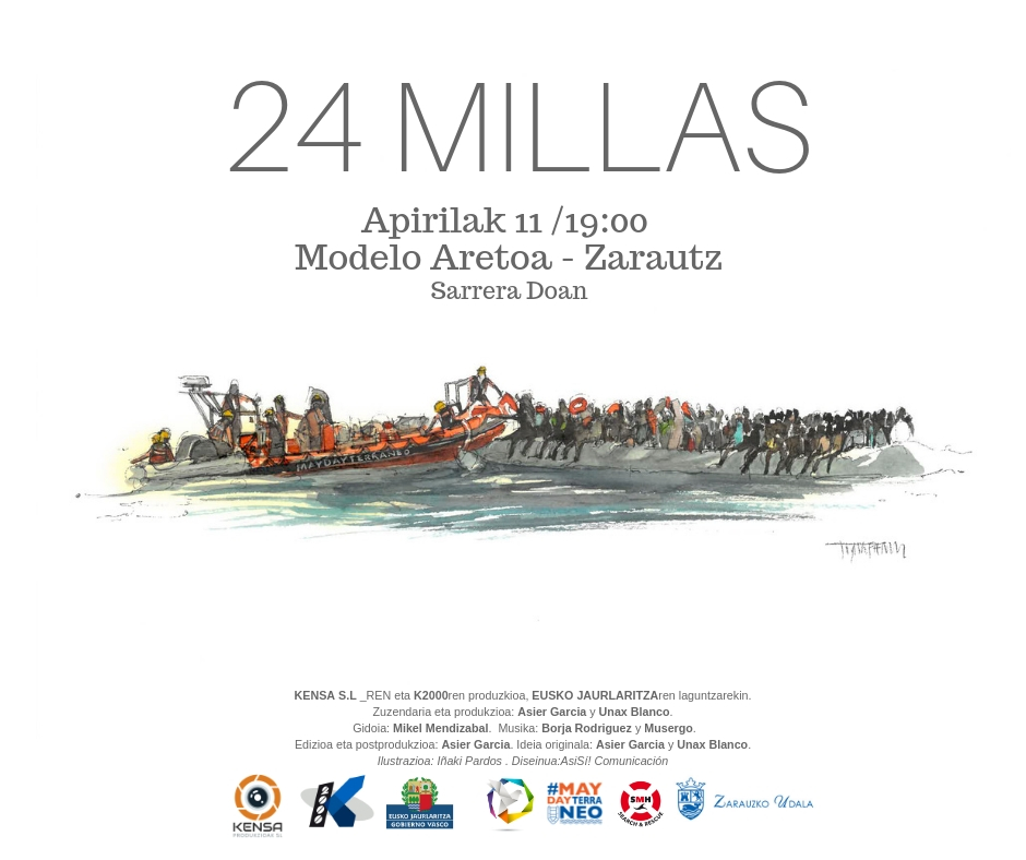 Beraz, gertaera zehatz batetik abiatuta, Mediterraneoko errrealitatea jasotzen saiatu dira 24 millas dokumentalaren egileak, eta baita Itsas Salbamentu Humanitarioko kideen lana ere. Apirilaren 11an, osteguna, emango dute Modelo aretoan, 19:00etan. Sarrera doakoa izango da.