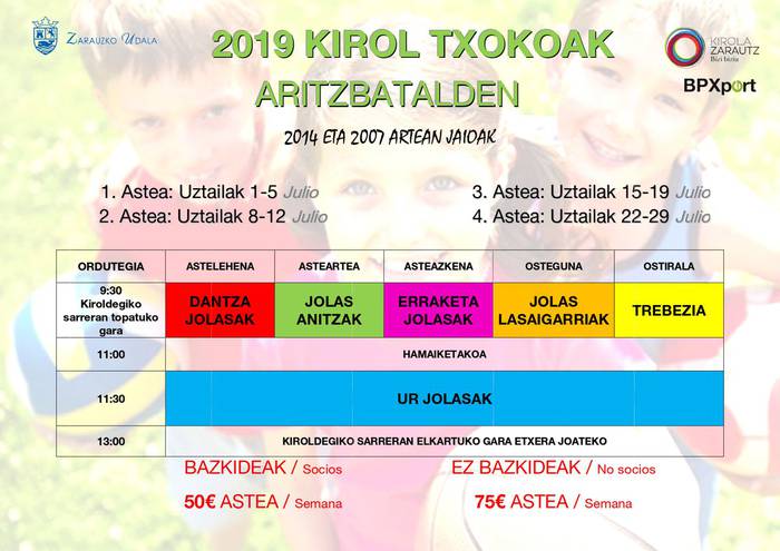 Uda honetan ere haurrentzako Kirol Txokoak izango dira Aritzbatalde kiroldegian. Uztailaren 1ean emango diote hasiera egitasmoari, eta 29an amaituko da. Hala, 2007 eta 2014 artean jaiotako haurrek lau astez izango dute Kirol Txokoetan jarduteko aukera, astelehenetik ostiralera. Hain zuzen ere, uztailaren 1etik 5era; 8tik 12ra; 15etik 19ra; eta 22tik 29ra bertaratu ahalko dute Aritzbatalden gazteenentzat antolatutako jolasetan parte hartzera.