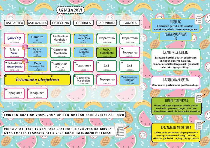 Ekintza batzuk Zarautzen bertan izango dira, eta beste hainbatetan irteerak egingo dituzte: Laurgainera, snorkel egitera edo Beizamako aterpetxera, besteak beste. Ondorengo irudian dago ikusgai uztaileko egutegia, osorik: