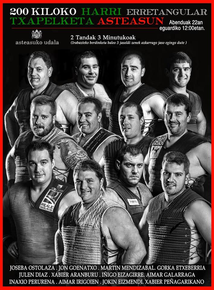 Azkenekoz duela 30 urte jokatu zuten harri-jasotzaile txapelketa berreskuratuta, 200 Kiloko Harri Errektangular Txapelketa jokatuko dute igandean, abenduaren 22an, Asteasuko (Gipuzkoa) pilotalekuan. 12:00etan hasiko da lehia, eta guztira hamabi harri-jasotzailek parte hartuko dute. Horien artean bi zarauztar ariko dira: Iñigo Eizagirre Eiza eta Jokin Eizmendi. Duela 30 urteko arau berekin jokatuko dute txapleketa: hiru minutuko bi txanda izango ditu harri-jasotzaile bakoitzak. Jasoaldi gehien lortzen dituena izango da txapelduna. Irabazlea erabakitzeko berdinketa hautsi beharra badago, hiru jasoaldi azkarren egiten duenak irabaziko du.