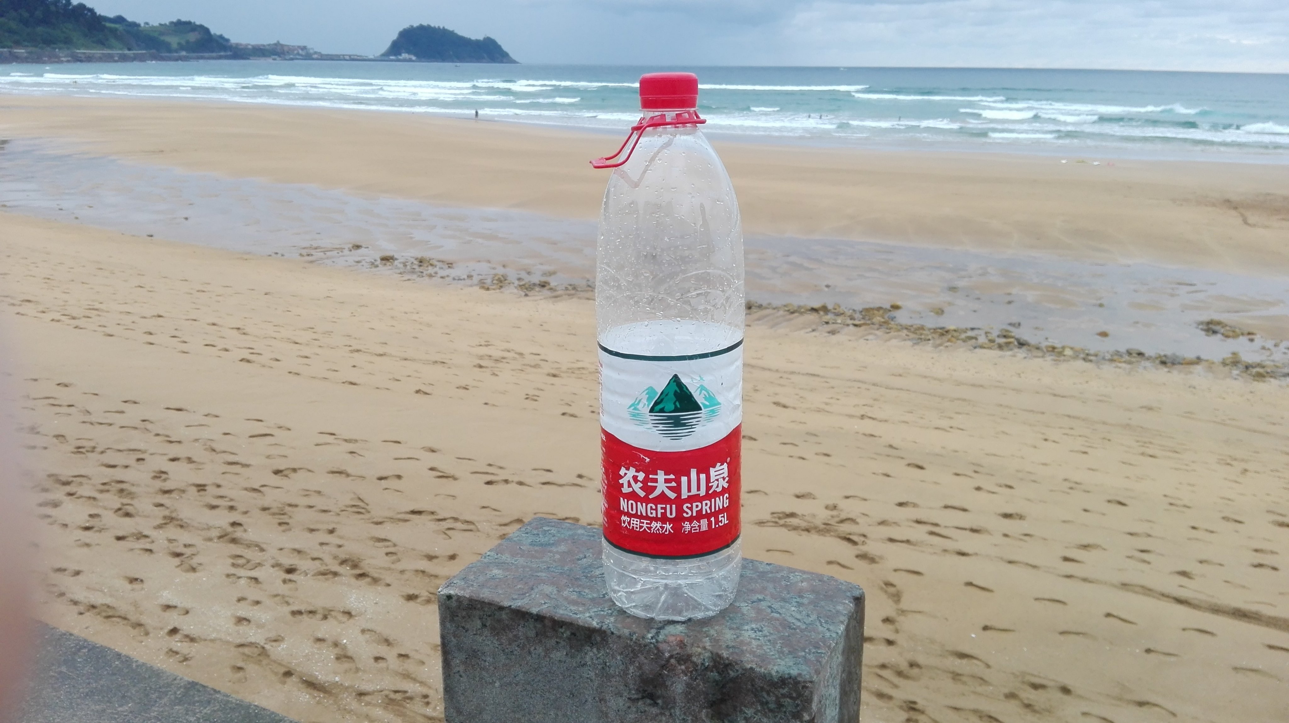 Txinako Nongfu Spring konpainiaren botila bat ur agertu da hondartzan, @chambertuX-ek bere twitter atarian igo duen argazkian ikus daiteken bezala. Itsasoak ekarritako hondakina den ala norbaitek hondarretan utzitakoa, hori da zalantza.