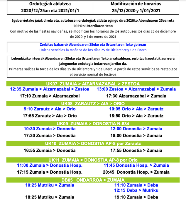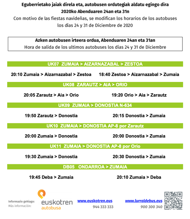 Gabonak direla eta, Lurraldebuseko autobus zerbitzuetako ordutegietan aldaketak izango dira. Lau egunetan moldatuko dituzte ordutegiak: abenduaren 24an eta 31n ohikoak baino goizago bukatuko dira, eta, aldiz, abenduaren 25ean eta urtarrilaren 1ean beranduago hasiko dira.