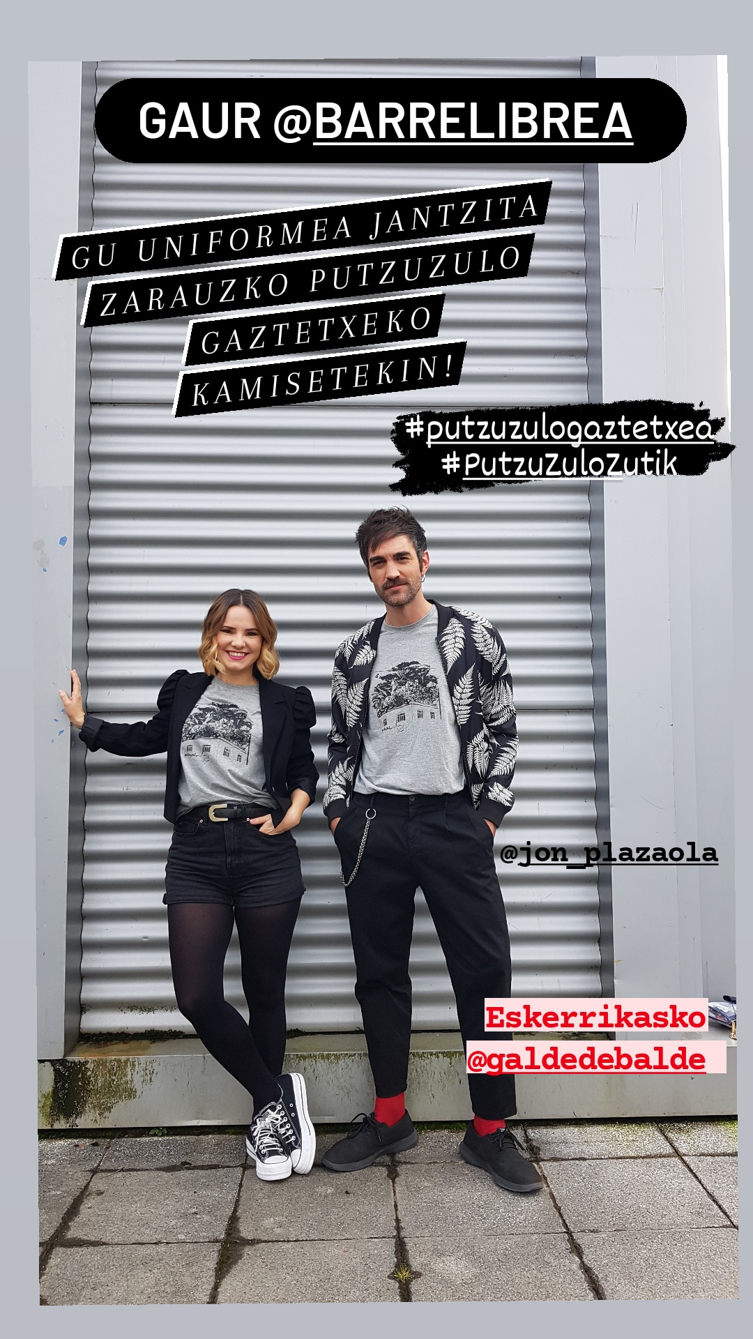 Aitziber Garmendia eta Jon Plazaola "uniformea jantzita" agertu ziren atzo Barre Librea telebista-programan: Zarauzko Putzuzulo gaztetxeko kamiseta jantzi zuten biek. Hain zuzen, aurreko astean izan ziren Putzuzulon, Arraio Irratiko Galdedebalde saio berezian, gonbidatu gisa.