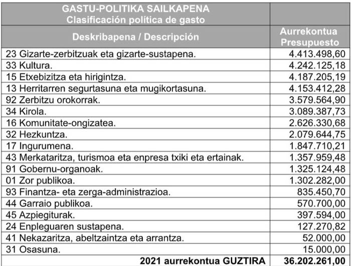 Amaitzeko, hirugarren taulan atal bakoitzera bideratutako diru kopurua zerrendatu dute. "Berriro ere, nabarmena da herritarren ongizateak duen garrantzia", gaineratu du Aranak.