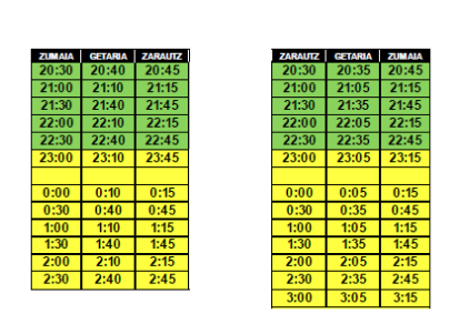 - Zarautz-Donostia: 00:55, 01:28, 02:10, 03:10, 04:10, 04:40 eta 05:30