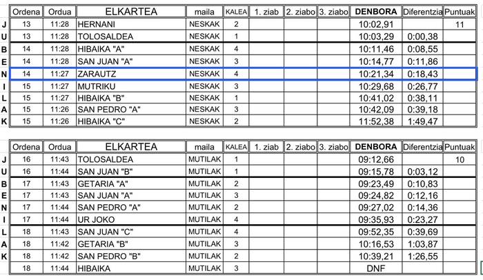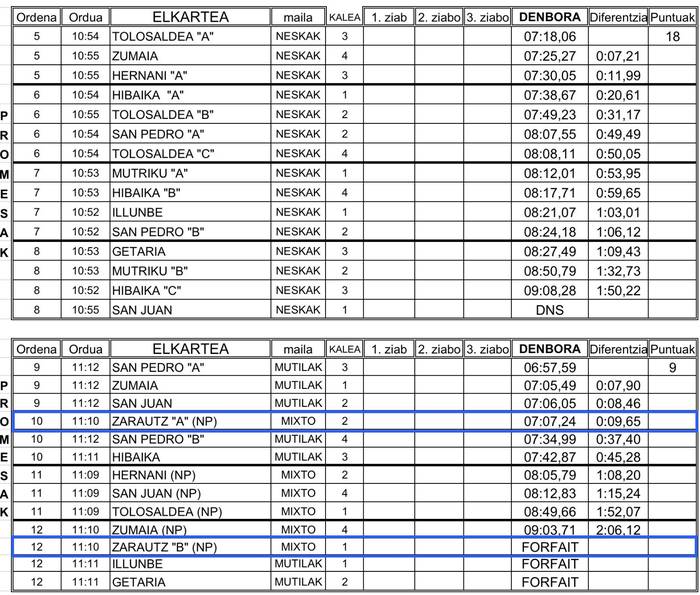 Esaterako, ZAEko infantil mutilak lehen bi postuak eskuratu zituzten, beraien estropadako azkarrenak izanik, eta neskak laugarren egin zuten. Promesen kategorian ontzi mistoek eta mutilek batera jokatu zuten estropada, eta ZAEko batel mistoak laugarren postua eskuratu zuen. Azkenik, jubenil neskek eta absolutu mutilek bosgarren eta seigarren postuarekin konformatu behar izan zuten, hurrenez hurren.