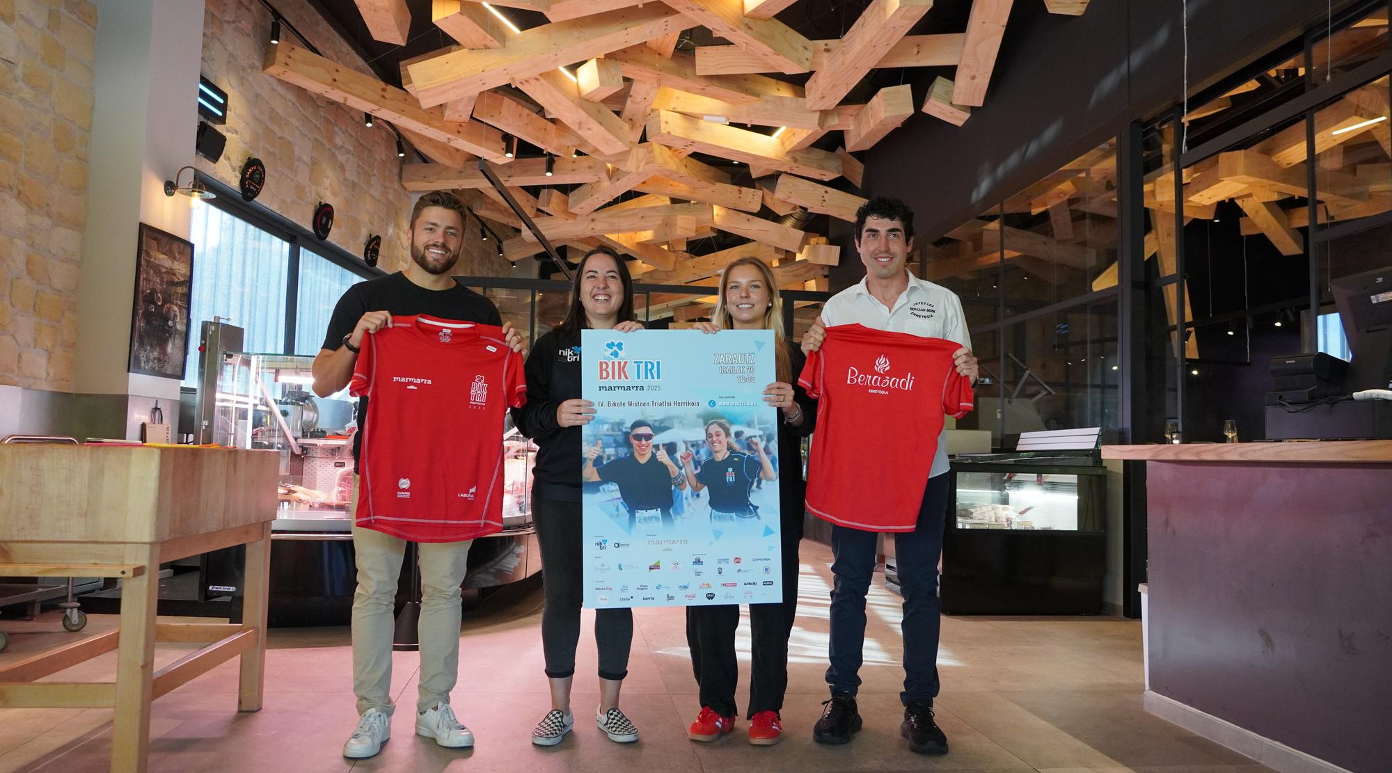 IV. Bikote Mistoen Triatloi Herrikoiaz gozatuko dute ehundaka lagunek larunbatean, Nik Tri triatloi elkartearen ekimenez. Probaren babesle nagusietako bat den Marmarra enpresaren kanpoaldean eman dituzte gaur ekitaldiaren inguruko xehetasun guztiak. Bertan parte hartu dute Nik Tri elkarteko Ane Arozenak, Zarauzko Udaleko Kirol zinegotzi Inaxio Illarramendik, Marmarrako ordezkari Ainhoa Gesalagak eta Berazadiberriko ordezkari Aitor Lizasok.