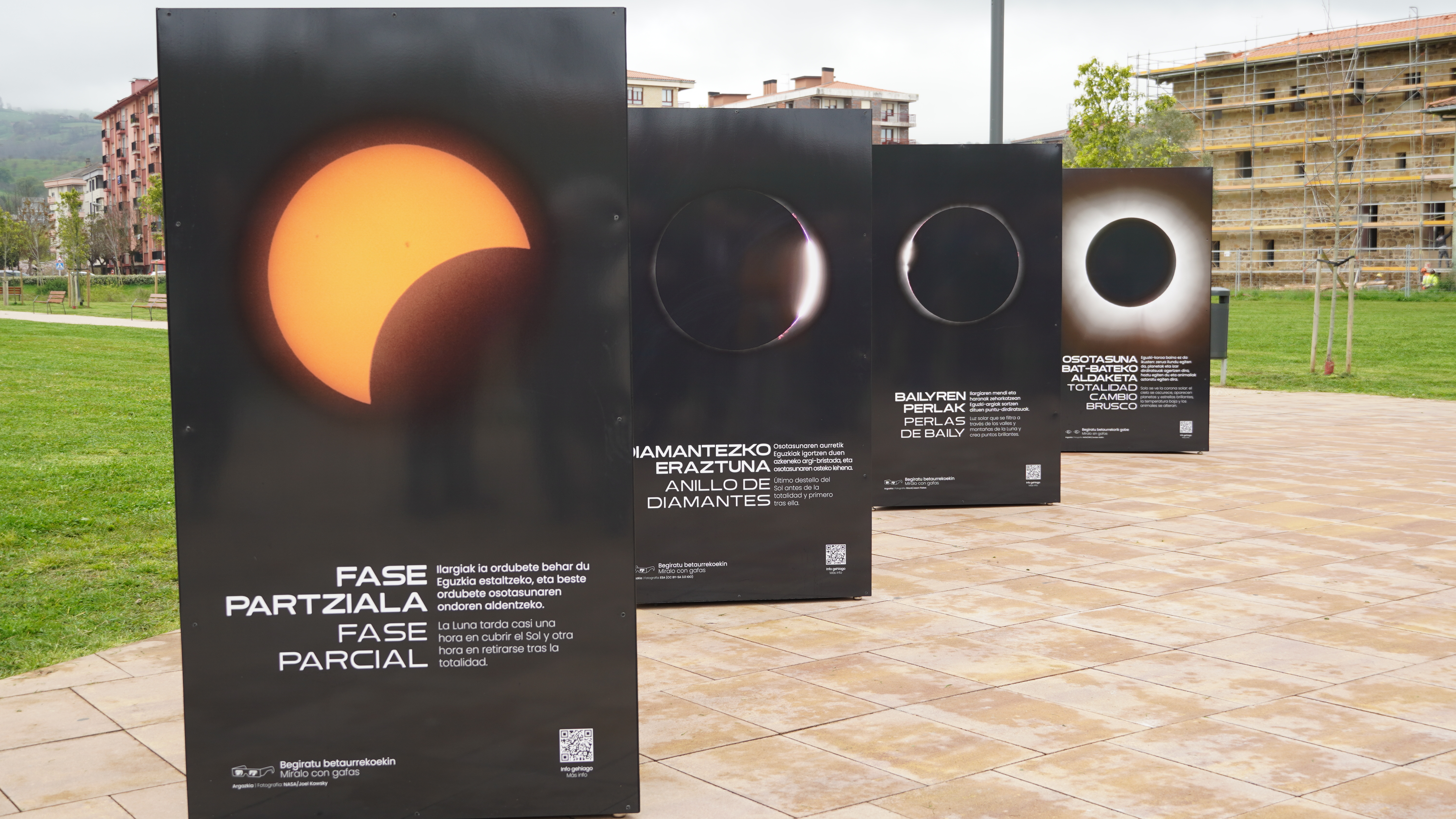 Lau blokek osatzen dute erakusketa, eta horiek ilustrazio zientifikoz zein idatzizko testuez beteta daude. Informazioa "modu didaktikoan, eskuragarrian eta erakargarrian" jarri nahi izan dute, "publiko zabal batera heltzeko asmoz". Panel horietan, esaterako, ondorengoa irakur daiteke: datozen urteetako eklipseak noiz izango diren, eklipse motak, fenomeno horiek nola gertatzen diren, eklipseak modu seguruan erreparatzeko gomendioak...
