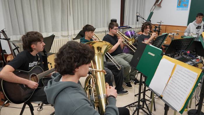 Hura bukatutakoan, "orain zer?", galdetu die irakasleak. Zalantzan egon dira, baina, azkenean, Neil Diamonden Sweet Caroline interpretatzea erabaki dute. Dena eman dute, eta bikaina izan da. Halakoxe giroa dute taldean, eta asterokoa dute hori. Gustura joaten dira musika eskolara, hala esan dute. "Tarte batez ikasketak eta bestelako kezkak albo batera uzteko aukera ematen digu hona etortzeak, eta oso ondo pasatzen dugu", adierazi dute gazteek. Nola ez, musika gustuko dute guztiek, horrek batzen ditu. "Gutako batzuek beste musika talde batzuetan-eta jotzen dute, baina talde hau desberdina da", ziurtatu dute. "Lasai jarduten gara hemen, inolako presiorik gabe jotzen dugu, eta giro onean; egia esan, eskertu egiten da astea horrela hastea". Musika eskolako hormetatik kanpora ere irteten dira taldean. Urtean behin behintzat jotzen dute herritarren aurrean, baina horrek baino gehiago betetzen ditu astelehenero elkartzeak.