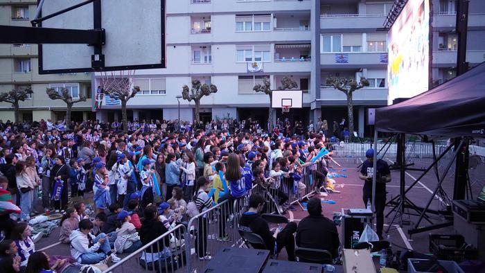 Etxeko egongela atzean utzi, eta taldean gozatzeko gogoz elkartu ziren auzoko futbol pistan lagun kuadrillak, familiak eta hainbat herritar. Denboraldi ezberdinetako Realaren elastikoak soinean, bufandak eskuan nahiz lepoan eta Anoetako harmailetan abesten diren animo kantuak ere ez ziren falta izan. Erosotasunari lehentasuna emate aldera, zenbaitzuk aulki tolesgarriak ere eraman zituzten, baina gehienek zutik ikusi zuten norgehiagoka zaletu fidelak bezala.